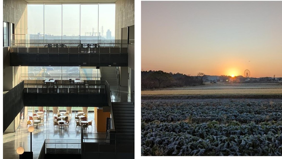 まぶしい朝日が差し込む学内のホールが、とても綺麗でした。